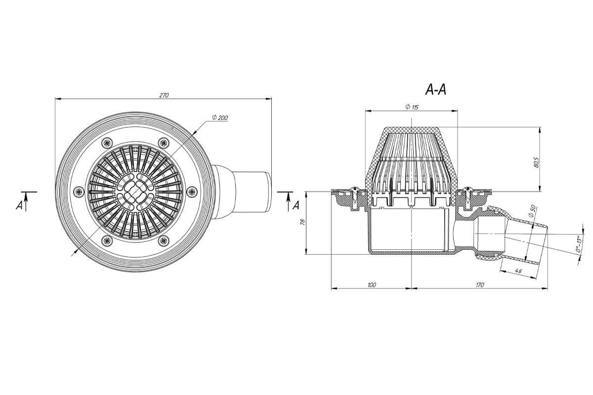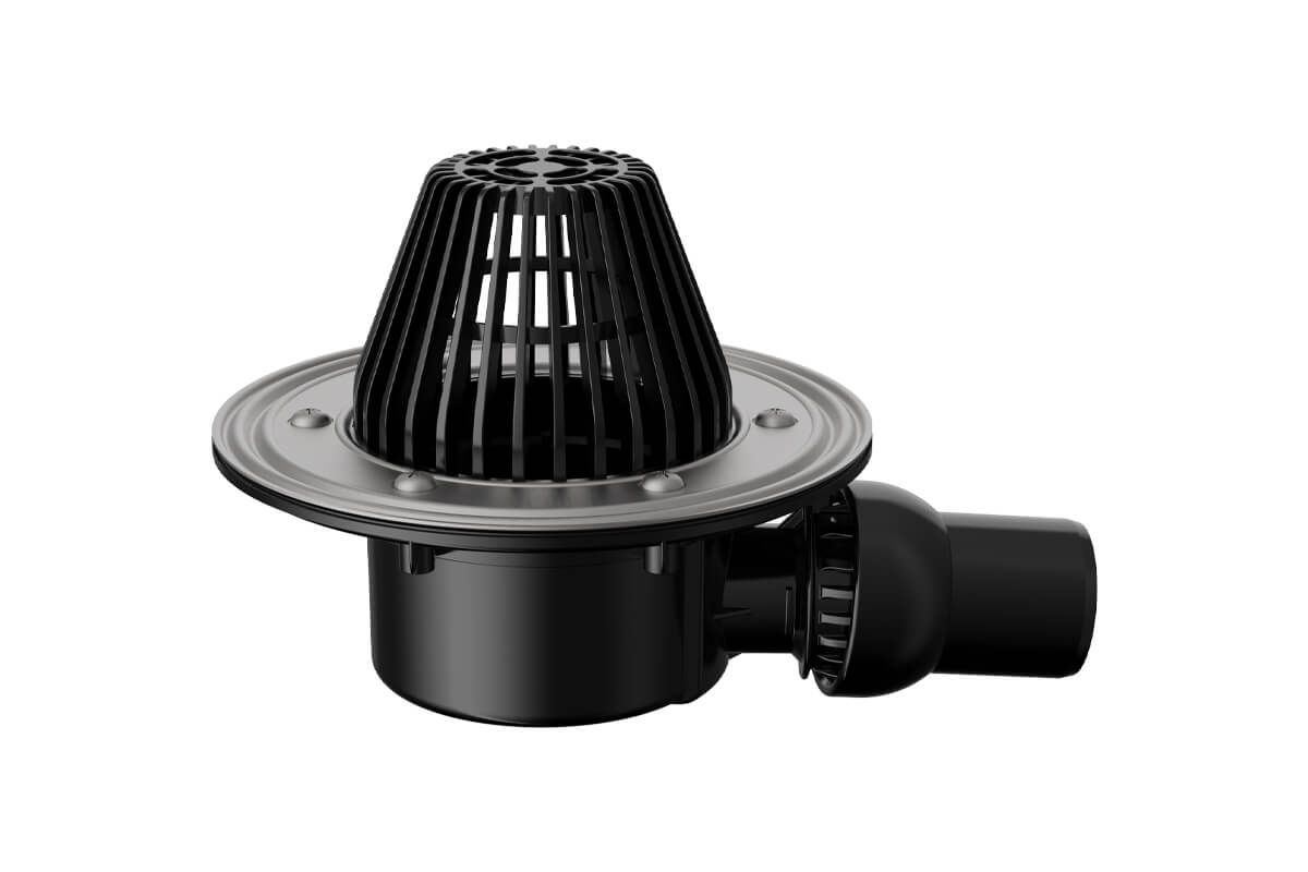 Воронка кровельная горизонтальная, регулируемый угол выпуска с листвоуловителем для неэксплуатируемых кровель, с прижимным фланцем (М-01.192) Ø50