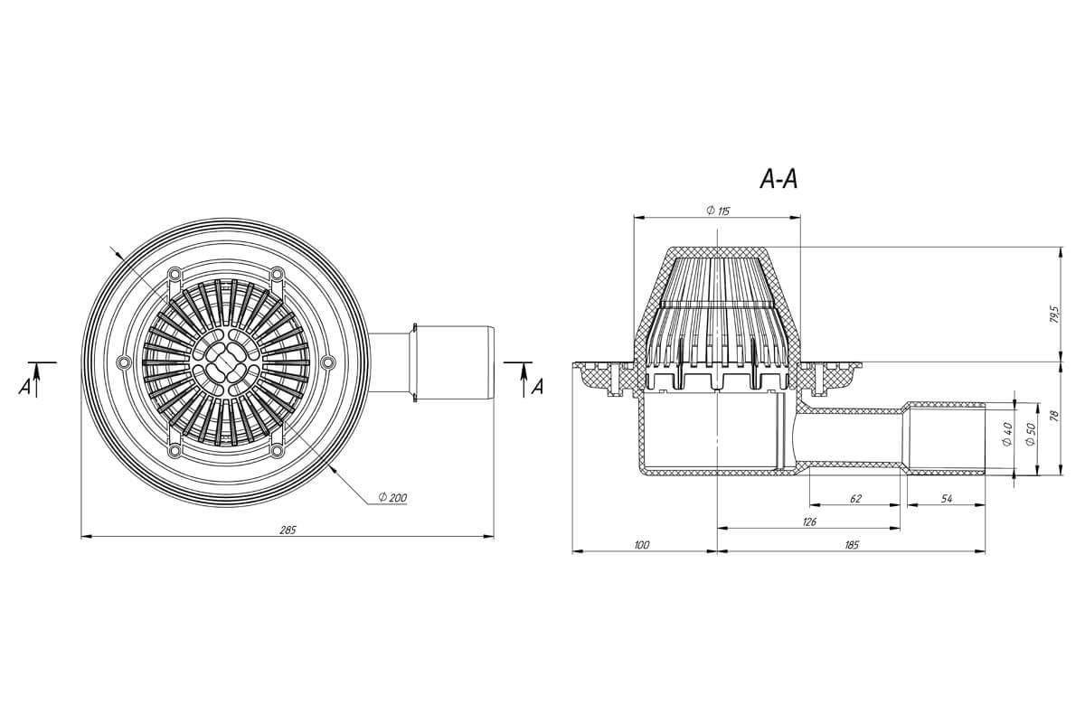 Воронка кровельная горизонтальная с листвоуловителем для неэксплуатируемых кровель, без прижимного фланца, с малой высотой корпуса (М-01.259) Ø40/50