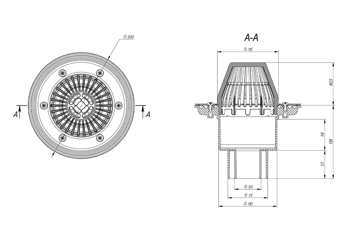 Воронка кровельная вертикальная с листвоуловителем для неэксплуатируемых кровель, с прижимным фланцем (М-01.184) Ø50/70/110