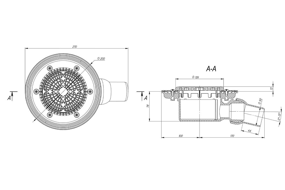 Воронка с плоским листвоуловителем для эксплуатируемых кровель, с прижимным фланцем (М-01.194) Ø50
